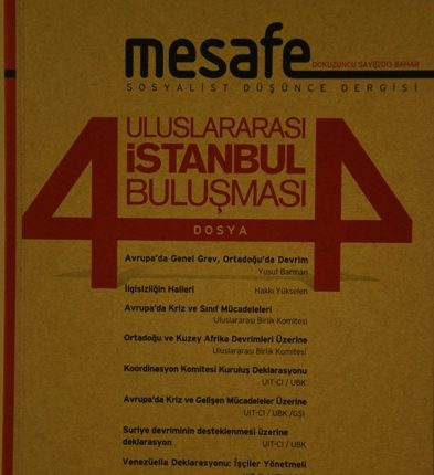 Bu amaçla, 2,3 ve 4 Kasım günlerinde İstanbul’da Uluslararası Birlik Komitesi (UBK) bileşenleri İşçi Cephesi ve Enternasyonalist Mücadele’nin (LI, İspanya) çağrıcısı olduğu bir buluşma gerçekleşti: Uluslararası İstanbul Buluşması. Bu buluşmaya Fransa, Almanya, Yunanistan’dan devrimci grupların yanı sıra, Latin Amerika ağırlıklı partileri ve deneyimleri bünyesinde toplayan İşçilerin Uluslarası Birliği-Dördüncü Enternasyonal (UIT-CI) de katıldı. Bu buluşmada uluslararası sınıf mücadelesinin bugünkü ana fay hatlarını oluşturan Avrupa’daki ekonomik kriz ve toplumsal mücadeleler; Arap devrimleri ve devrimlerin bugünkü merkezî noktası olan Suriye; Venezuela’daki politik durum ve Chavez’in “21. yüzyılın Sosyalizmi” söylemi konuları tartışıldı ve ortak kararlar alındı. Bu nedenle Uluslararası İstanbul Buluşması, hem sınıf hareketine müdahale etme ve onun içerisinde mevzilenmeye dair politik yanıtlar geliştirebilmenin yollarını arama, hem de 4. Enternasyonal’in yeniden inşası yolunda önemli bir çaba anlamına geliyor. Tüm bu nedenlerden ötürü, Mesafe’nin 9. sayısını Uluslararası İstanbul Buluşması’na hasrettik. Bu sayıda, bu buluşmada uluslararası sınıf mücadelesi ve dünya durumuna ilişkin yaptığımız tartışmalarda neticelendirdiğimiz politik analizlere ve karar dökümanlarımıza yer veriyoruz.