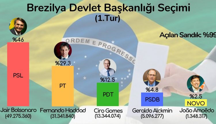 Böylesi koşullarda, başkanlık seçimlerinin ilk turunda Bolsanaro oyların yüzde 46’sını alarak İşçi Partisi’nin adayı Fernando Haddad ile 28 Ekim’de yapılacak olan ikinci turda yarışacak. Bolsanaro ciddi bir oy patlaması gerçekleştirdi. Öte yandan diktatörlük yanlısı programı 21 yıllık kesintisiz askeri cunta geçmişi olan bir ülkede tüm demokratik kesimleri, “Ona Hayır” kampanyasında, hem sokakta hem de sandık için seferber etmiş durumda.