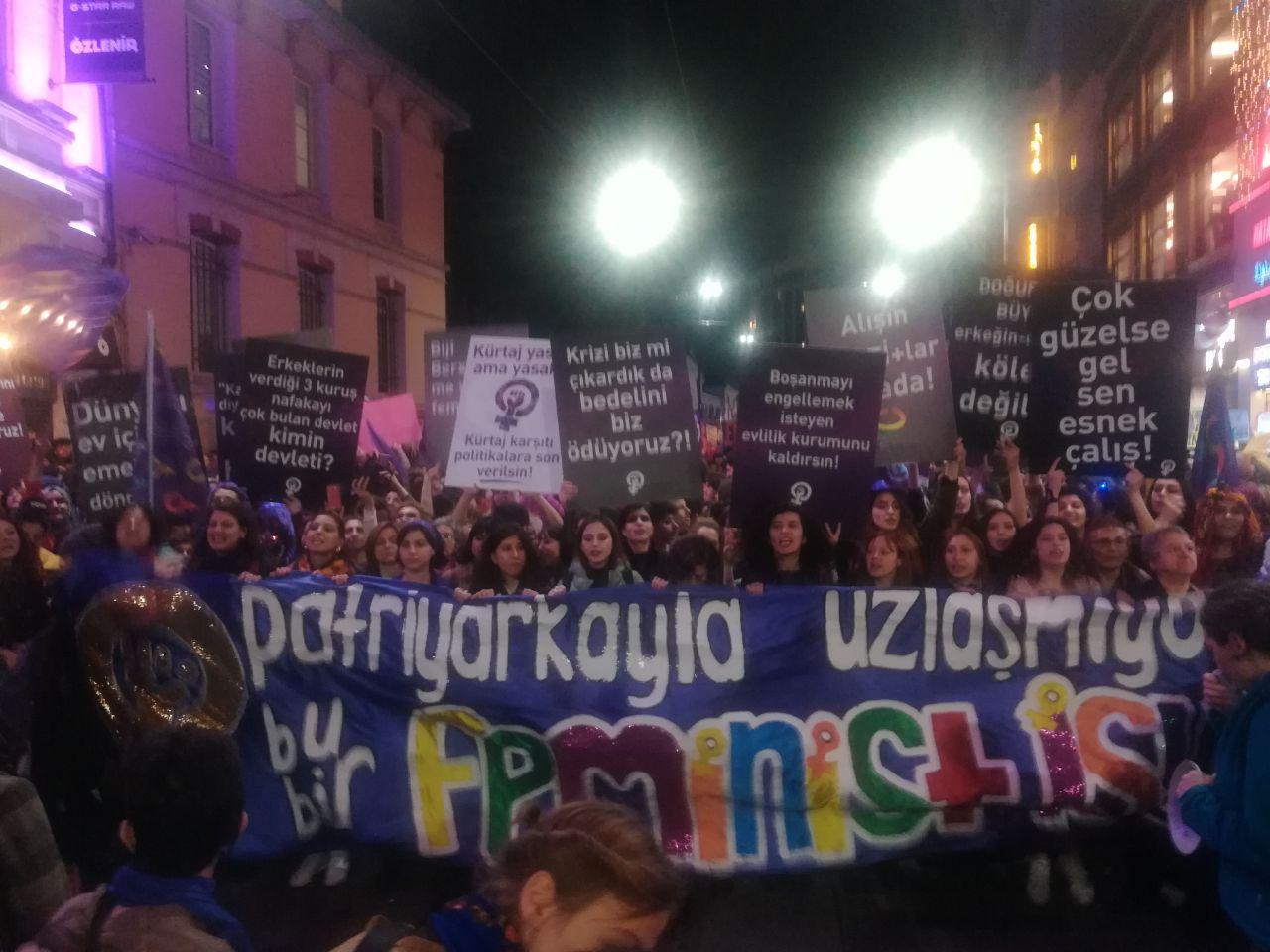 Kadınlar polisin tüm bu engellemelerine rağmen Fransız Kültür Merkezi’nin önünden Taksim Meydanı’na taşacak kadar yoğun bir kalabalık oluşturdu. İstanbul Valisi ve Emniyet’in kadınları bir araya getirmemek için sarf ettiği bu yoğun çaba büyük bir korkunun göstergesidir ve bu baskı kadınları asla yıldırmadı! Aksine 19.30’a doğru kadınlar giderek kitleselleşti ve meydana taştı. Kadınlar polisin saldırısına kadar sloganlarla coşkulu bir biçimde yürümek için bekledi. Ancak basın açıklaması polisin yürüyüşe izin vermemesi ve gaz saldırısı nedeniyle yapılamadı. Bunun üzerine kadınlar Taksim’in ara sokaklarında eylemi sürdürdü.