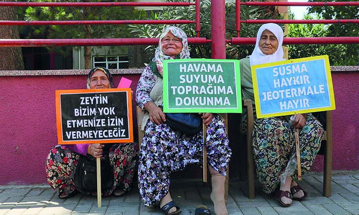 Büyük Menderes Havzası, jeotermal kaynaklarının en yoğun olduğu bölge. Santral ve kuyu sayısına göre 1. sırada yer alan ve topraklarının %75’i jeotermal kullanımına açılan Aydın’da köylüler bir süredir çeşitli baskılara ve tehditlere rağmen direniyor. Bu direnişlerden Kızılcaköy’ü, biber gazıyla saldırılan köylülerin karşısında mandalina yerken “Biber gazından bir şey olmaz ya” diyen vali yardımcısından hatırlarsınız. Vali yardımcısının pişkinliğiyle gündeme oturan olay, Kızılcaköy’de bir ilk değildi, zira 1 yılı aşkın süredir devam etmekte olan direnişe polis ve jandarma biber gazı ve TOMA’larla defalarca müdahale etti. Bir diğer direniş ise Yılmazköy’de devam ediyor. Zeytinliğin içine JES kurmak isteyen şirkete karşı köylüler dava açmış ve davayı kazanmıştı. Ancak şirket buna rağmen çalışmaya devam ediyor ve dahası, köylülere tazminat davası açtı. Üstelik ne bölgede üretim lisansı ne de çalışma izni ve yapı ruhsatı mevcut. Son olarak geçtiğimiz günlerde 86 yaşındaki bir çiftçi, JES hattındaki bir çukura düşerek hayatını kaybetti. Yani şirket, yapım çalışmalarında bile gerekli önlemi almıyor. Aydın gibi Manisa, İzmir ve Denizli’de de benzer JES direnişleri gerçekleşmekte. Manisa, Salihli’de santral inşaatı, halkın büyük tepkisi nedeniyle polis ve jandarma gözetiminde sürdürülmekte.