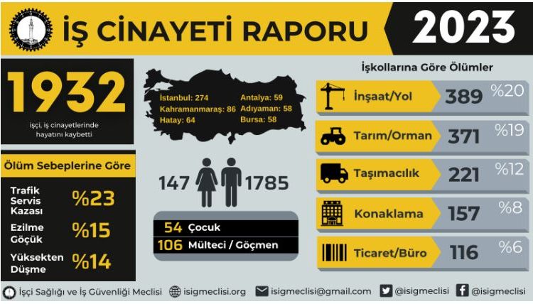 İşçi Sağlığı ve İş Güvenliği Meclisi (İSİG) 2023 iş cinayetleri raporunu geçtiğimiz günlerde açıkladı. Bu rapora göre 2023’te 1932 çalışan iş cinayetlerinde hayatını kaybetti. Yani günde 5’ten fazla çalışan öldürüldü. Bu ölümlerin istatistiklerine bakıldığında inşaat, taşıma ve tarım sektörleri ölümlerin yarısını oluşturan sektörler olmuşlar. 2023 yılında hayatını kaybeden işçilerin yüzde 97’si sendikasız çalışmaktaymış. Bu ölümlerin içerisinde azımsanmayacak kadar göçmen işçi de bulunmakta. Göçmen işçiler kayıtsız, sigortasız, güvencesiz bir şekilde köle gibi çalıştırılmaktalar.