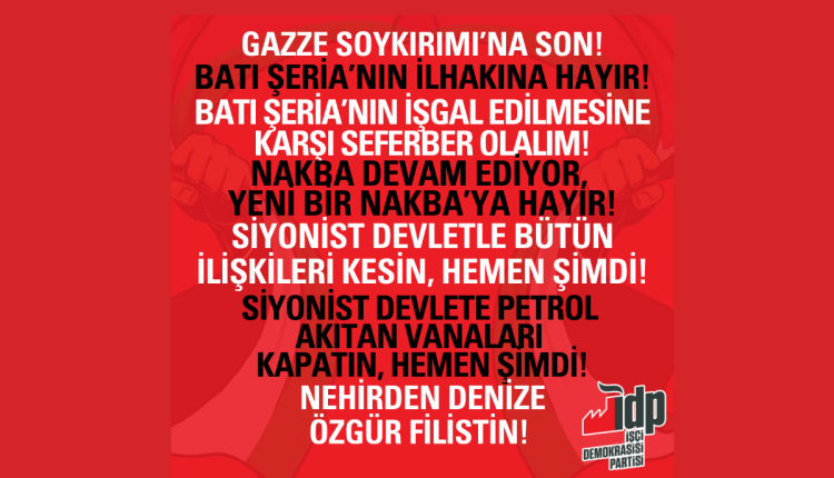 İşçi Demokrasisi Partisi olarak Gazze’de ve Batı Şeria’da sürmekte olan soykırım ile işgale karşı Filistin Direnişi’ni ve Filistin halkının geri dönme ve kaderini kendisinin tayin etme mücadelesini desteklediğimizi bir kere daha ifade ediyoruz.