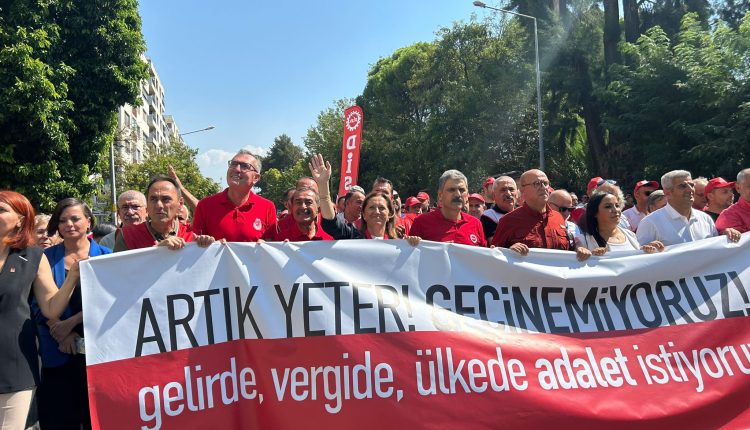 Ülkenin farklı bölgelerinde, çeşitli şehirlerde işçi buluşmaları ve eylemler gerçekleştiren DİSK “Gelirde adalet, vergide adalet!”, “Artık yeter geçinemiyoruz” şiarıyla İzmir’de bölge mitingi gerçekleştirdi.