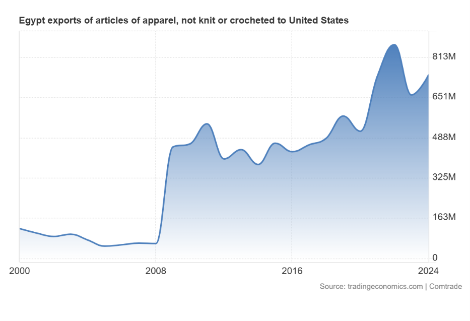 Bugün Mısır’ın ABD’ye ihracatının ise %45’ini sadece giyim ürünleri oluşturuyor. Yandaki grafikte Mısır’dan ABD’ye gerçekleşen tekstil ihracatının evrimi görülüyor. QIZ anlaşmalarının devreye girdiği 2008 yılı sonrasında nitel sıçrama gerçekleşiyor. 2020 pandemisi sonrası daha da artıyor.
